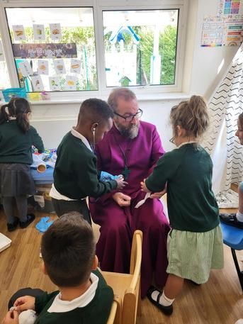 Instead of just talking to the Bishop about what we did, a few of the class counsellors brought their class prayer books for the bishop and the other adults to see. The Bishop (and the other adults) said that they had really enjoyed looking at our prayer books and all of the art inside them. After this the Bishop pointed out an interesting point. He asked us what Genesis 1v1 said and we all answered ‘ In the beginning’. After this, he asked us what John 1v1  said and we replied again ‘In the Beginning’ this made us realise that there was something special before the world began and that there was another something else that was as special as the first one.
